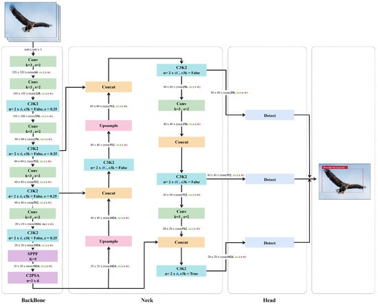 YOLOv11 demonstrates a superior speed–accuracy trade-off, particularly in real-time monitoring under complex environmental conditions. The model architecture consists of three core components: a backbone network, a feature fusion module, and a detection head (Figure 5). In the backbone, YOLOv11 introduces a novel C3K2 module (Cross-Stage Partial with Kernel Size 2), which reduces computational costs by employing smaller convolutional kernels while maintaining representational capacity compared to the C2f structure in YOLOv8. The model retains the SPPF (Spatial Pyramid Pooling–Fast) module to integrate local and global context through multi-scale pooling, thereby enhancing perception across varying object sizes.