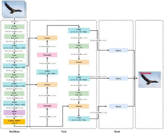 The Enhanced YOLOv11 network structure, modified from [16]. It replaces the FFN layer in the original C2PSA module with MSFN, forming a new C2PSA_MSFN module.