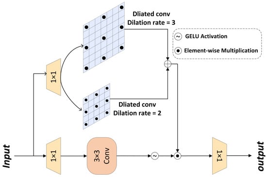 Here, denotes element-wise multiplication, represents the GELU nonlinear activation function, denotes a 3 × 3 dilated convolution with a dilation rate of 2, and denotes a 3 × 3 dilated convolution with a dilation rate of 3.