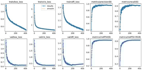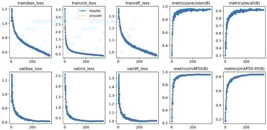 Figure 8 and Figure 9, respectively, illustrate the training process curves for both the baseline YOLOv11n and the improved MSFN-YOLOv11n model on a noise-containing dataset. These figures depict trends in loss functions, including box loss, classification loss (cls loss), and distribution focal loss (DFL loss), as well as detection accuracy based on Intersection over Union (IoU) thresholds of ≥0.5. Collectively, these metrics reflect the model’s learning behavior and generalization performance under conditions of feature degradation. The training classification loss of the improved model commenced at 3.5, which is slightly higher than the original model’s loss of 3.0. However, it decreased rapidly over the epochs, converging to approximately 0.5, thus matching the performance of the original model. This improvement indicates more efficient feature learning due to the integration of the MSFN module. Regarding validation loss, both models achieved similar final values (val/box_loss ≈ 0.6); nonetheless, the improved model exhibited a smoother curve with reduced fluctuations, signifying enhanced generalization capability and greater robustness to noise and sample variability. Overall, the loss and accuracy curves confirm that the MSFN-YOLOv11 outperforms the original model, achieving both faster convergence and greater stability.