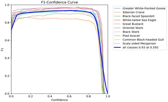 The F1–confidence curve provides a two-dimensional evaluation of detection quality through parameterized window scanning. Figure 10 and Figure 11, respectively, illustrate the confidence curves for both the original YOLOv11 and the improved model, respectively. The F1 score, defined as the harmonic mean of precision and recall, serves as a metric for assessing the overall performance of the model across various confidence thresholds. Both models demonstrated high F1 scores at elevated confidence levels, indicating an effective balance between precision and recall in object detection. Notably, when the F1 score reached 0.93, the confidence threshold of the improved MSFN-YOLOv11 model increased from 0.592 to 0.595, reflecting enhanced stability in high-confidence predictions and a decrease in low-confidence misjudgments. Within the 0.6~0.8 confidence interval, the fluctuations of the curve were minimized, thereby reducing misjudgments attributed to feature blur, which renders it more suitable for species classification tasks in ecological monitoring.