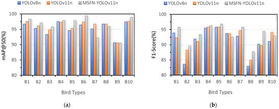 A comparative analysis was further conducted to evaluate the recognition performance disparities across ten distinct bird categories: the Black Stork (B1), Black-faced Spoonbill (B2), Common Black-headed Gull (B3), Great Bustard (B4), Greater White-fronted Goose (B5), Oriental Stork (B6), Pied Avocet (B7), Scaly-sided Merganser (B8), White Crane (B9), and White-tailed Sea Eagle (B10). The quantitative results, detailed in Table 5 and visualized in Figure 12, demonstrate that the proposed MSFN-YOLOv11 model achieves superior or highly competitive detection accuracy compared to the YOLOv8n baseline and the original YOLOv11n. Specifically, MSFN-YOLOv11 attained the highest mAP@0.5 in nine out of the ten categories (B1–B6, B8–B10), with a particularly notable performance in category B6, where it reached 99.4%, surpassing YOLOv8n (96.4%) and YOLOv11n (97.4%). In terms of F1-Score, which provides a balance between precision and recall, the proposed model also led in seven categories (B1–B5, B7–B9). A significant improvement is observed in B9, where the F1-Score rose to 94.4%, a clear gain over the 90.2% and 89.7% values achieved by the other two models, respectively. While MSFN-YOLOv11’s F1-Score was slightly lower in B6 and B10, its performance in the mAP@0.5 metric for these categories remained the highest, indicating robust detection capability. Overall, the consistent outperformance of MSFN-YOLOv11 across the majority of bird types underscores its enhanced feature representation and classification stability for avian detection tasks.