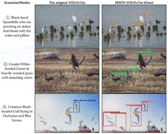To scientifically evaluate the detection performance of the improved model in complex scenes, a comparative experiment was conducted using a bird image dataset characterized by typical interference features. The test samples covered three challenging scenarios: (i) birds perching on stakes that blend with the water and pillars (e.g., Figure 13①); (ii) birds in heavily weeded grass with matching colors (e.g., Figure 13②); and (iii) motion-blurred images of birds in flight (e.g., Figure 13③). All images contained noises. The detection results are illustrated in Figure 13. The experimental results indicate that the MSFN-YOLOv11 achieved higher target recognition accuracy under similar background conditions, exhibiting significantly enhanced feature capture capability. In clustered scenes, the original model was susceptible to unrecoverable recognition errors, whereas the improved model yielded more accurate recognition results.