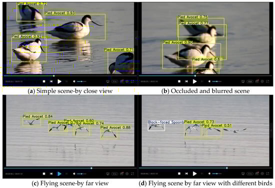 Figure 14a–d presents visualization recognition results of the MSFN-YOLOv11 model on a real-world surveillance video for Pied Avocets, capturing clustered behaviors such as foraging, perching, and flight under challenging imaging conditions including water surface reflections, motion blur, and occlusion. The model achieves high confidence levels (often exceeding 70%) in open scenes with stationary or slow-moving birds and maintains robust detection (≈60% confidence) under mild blur or reflection. However, in high-speed flight scenarios where birds appear as small, blurred targets with obscured discriminative features, recognition performance declines, leading to occasional false positives and missed detections. These results validate the model’s practical utility in realistic wetland settings, while highlighting a direction for future improvement in handling highly dynamic small targets. Such enhancements could further support ecological applications like tracking migration paths and generating dynamic species distribution maps.