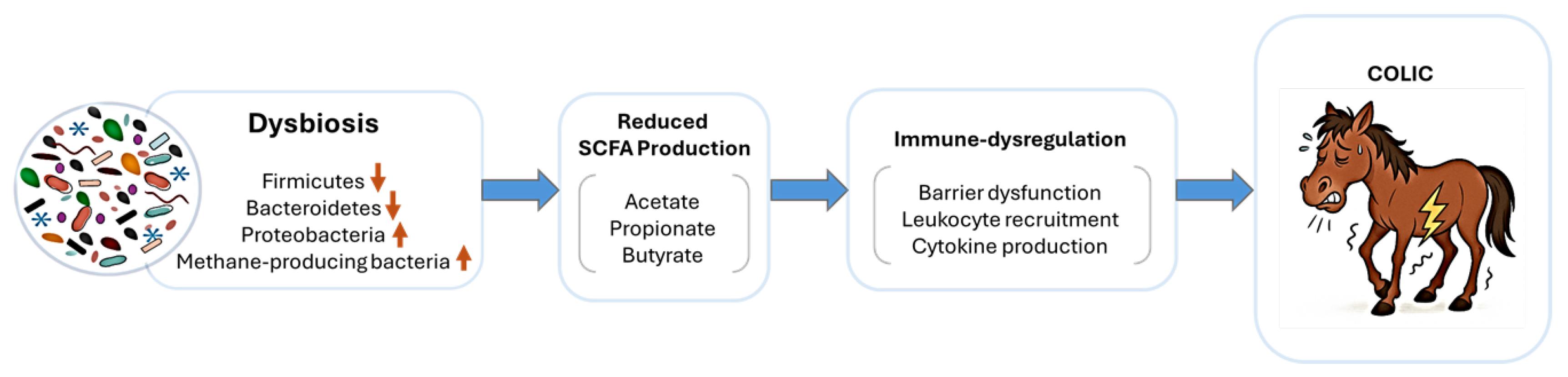 - Lara, F.; Castro, R.; Thomson, P. Changes in the gut microbiome and colic in horses: Are they causes or consequences? Open Vet. J. 2022, 12, 242–249. [Google Scholar] [CrossRef]