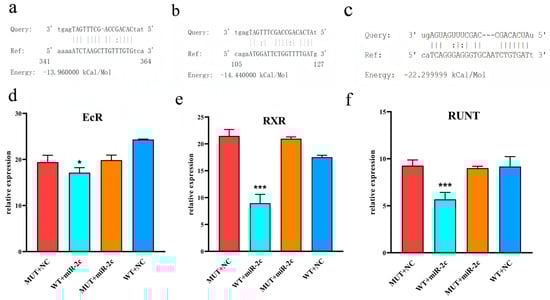 Effect of miR-2c on EcR, RXR and Runt genes detected by dual luciferase reporter system. (a) miRanda prediction of miR-2c targeting EcR. (b) miRanda prediction of miR-2c targeting RXR. (c) miRanda prediction of miR-2c targeting Runt. (d) Interaction between EcR and miR-2c; “*” indicates p < 0.05. (e) Interaction between RXR and miR-2c; “***” indicates p < 0.001. (f) Interaction between Runt and miR-2c; “***” indicates p < 0.001. WT: Wild-type-3′UTR pmir-GLO, NC: Negative Control mimic, miR-2c: miR-2c mimic, MUT: Mutant-type-3′UTR pmir-GLO, WT + miR-2c served as the experimental group, while MUT + NC, MUT + miR-2c, and WT + NC served as the control groups.