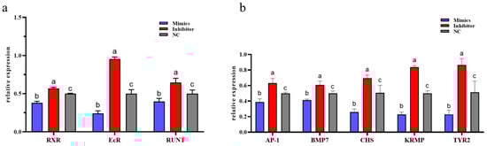 To further validate this regulatory association in vivo, EcR, RXR, and Runt expression was assessed following overexpression and inhibition of miR-2c by exogenous injection of mimics and inhibitor. The relative expression levels of RXR, EcR, and Runt were significantly reduced in the mimics group compared with both NC and inhibitor groups (p < 0.05). In contrast, expression in the inhibitor group was significantly higher than in the NC and mimics groups (p < 0.05) (Figure 4a).