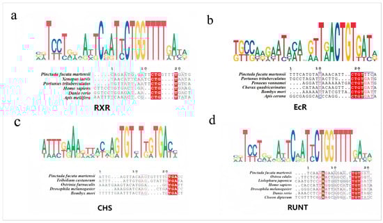 Sequence alignment of RXR, EcR, CHS and Runt between P. f. martensii and other species. (a) Alignment of miR-2c interaction sequence with RXR-3′UTR. (b) Alignment with EcR-3′UTR. (c) Alignment with CHS-3′UTR. (d) Alignment with Runt-3′UTR. Dark regions indicate 100% identical bases; lighter regions indicate strong similarity.