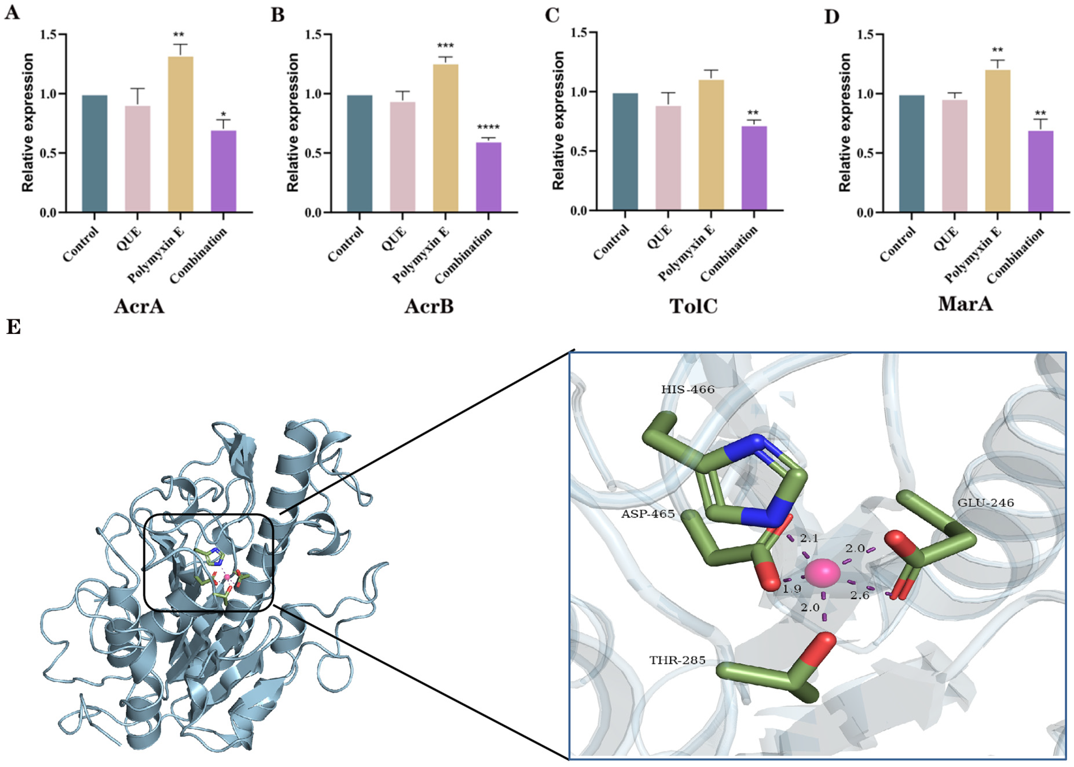 3.5. QUE Suppresses the Expression of Genes Associated with the AcrAB-TolC Efflux Pump System in Bacteria