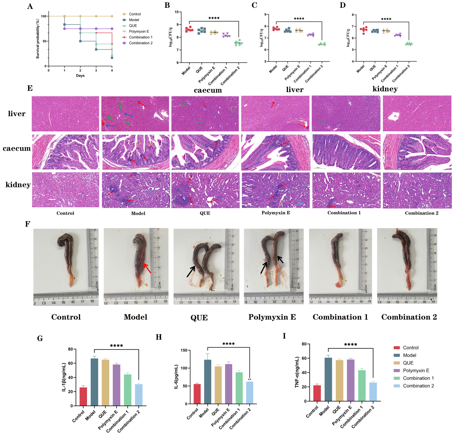 3.7. QUE in Combination with Polymyxin E Demonstrates Protective Efficacy in Chickens Infected with E. coli JD37
