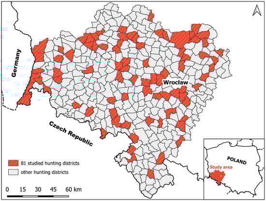 The study was conducted in a forest-farmland in south-western Poland, partly adjoining the borders with Germany and the Czech Republic (Figure 1). The study area is divided into 360 hunting districts, which are administered by 264 hunting clubs and 16 state forest services. These hunting districts cover a total area of 16,581.1 km2 comprising 11,079.5 km2 of farmlands and 5506.6 km2 of forest. Game management is supervised by the Regional Directorate of State Forests in Wrocław [43].