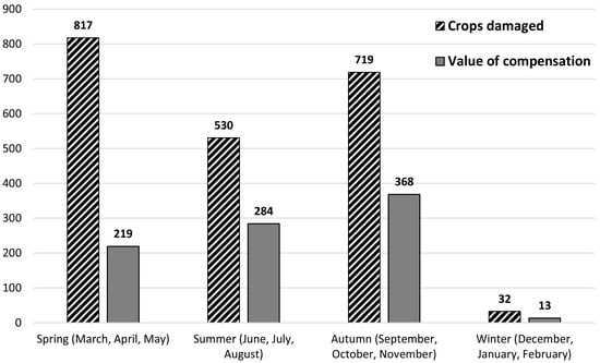 The largest year-round percentage of damaged crop areas, higher than the percentage of compensation paid (39.0% vs. 24.5%), occurred in spring. In summer and autumn, the percentage of compensation paid for the losses caused by wild boar was higher than the percentage of crop area damaged. Relative to spring, summer, and winter, autumn represents the highest percentage (42.0%) of compensation.