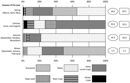 Figure 3 presents three-year cumulated percentage areas of six agricultural crops damaged by wild boar during the four seasons of the year. In spring, the green foliage of maize as well as various cereal crops and grasslands amounted to 87.7% of all damaged crop areas. In summer, ripe cereal crops of various species constituted 59.7% of damaged areas. In turn, ripe maize strongly predominated among all crops damaged in autumn, representing 78.7% of the whole area of crop species destroyed by wild boar. In winter, more than half of the area of boar-inflicted damage (50.9%) was recorded in grasslands. A considerable percentage (25.8%) of damaged areas were covered by winter crops of various cereal species.