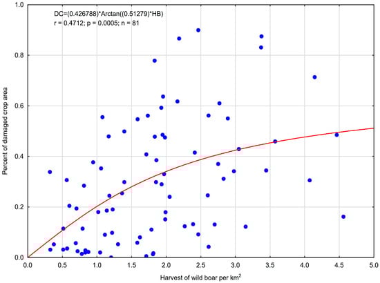 Calculations performed for 81 hunting districts showed a positive correlation significant between the harvest rate of wild boar and the percentage of farmland area damaged by these animals only for the 2014/15 hunting season (Figure 4). The following equation presents the demonstrated relationship: