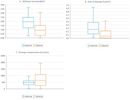 Comparison of the average values (median) of variables (A) Wild boar harvested/km2, (B) Area of damage (ha/km2), and (C) Damage compensation (€/ha) between the 2015/2016 and 2022/2023 seasons.