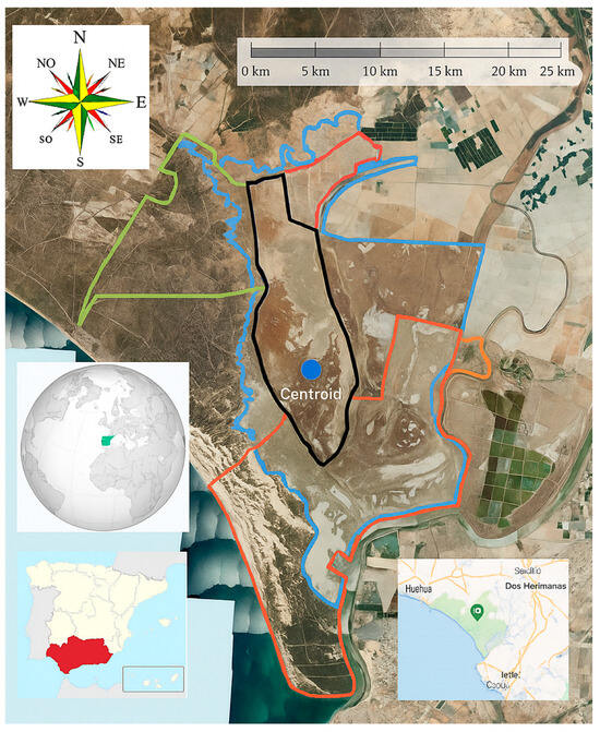 The study area is located in southwestern Andalusia, Spain, within the Doñana National Park and the marshlands that surround it [34]. The protected area is made up of parts of the provinces of Huelva, Seville, and Cádiz. It is known for its high ecological value and the wide range of habitats it contains. The main national park and buffer zones are in the larger Doñana region, which is more than 1300 km2 in size.