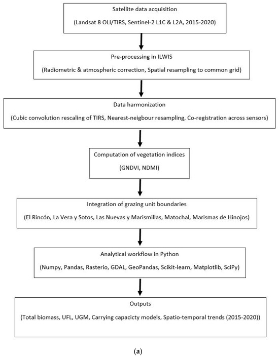 (a) Data processing workflow applied to estimate the rangeland carrying capacity for the Marismeño horse in Doñana National Park, Spain, during the period 2015–2020. (b) Python 3.9 summarized workflow for satellite data processing and modeling.