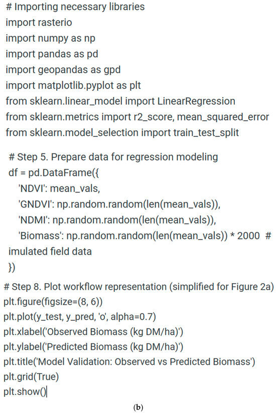 The summarized code below (Figure 2b) illustrates the complete workflow (from satellite image preprocessing to vegetation index calculation, regression-based biomass modeling, and validation) corresponding to the processes outlined in Figure 2a.