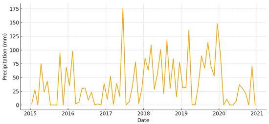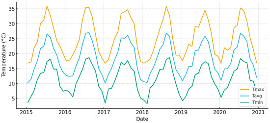 According to [42] (https://en.climate-data.org/), the Mediterranean pulse can be seen in monthly precipitation, which changes a lot from year to year (Figure 3). From late fall to spring, wet-season totals build up, with occasional monthly peaks that are very high. Every year, the summer months are always dry, which creates a long period of water stress. Monthly temperatures follow a tight seasonal cycle (Figure 4), with a maximum temperature (Tmax) frequently exceeding 30 °C in summer and a minimum temperature (Tmin) falling below 10 °C in winter. This hydroclimatic background sets the stage for the timing of forage availability and the growth of plants across the marsh–vera gradient [34,35].