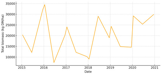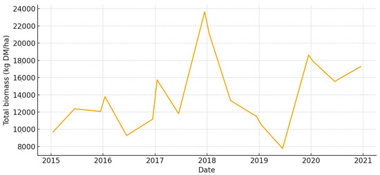 Total aboveground biomass (kg DM/ha) in La Vera y Sotos (2015–2020).