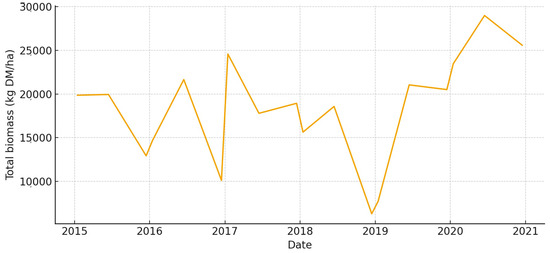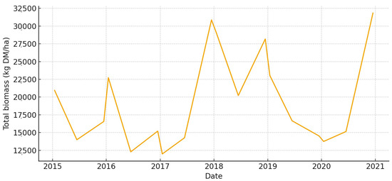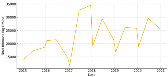 Total aboveground biomass (kg DM/ha) in Matochal (2015–2020).