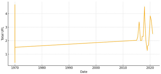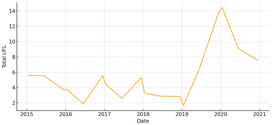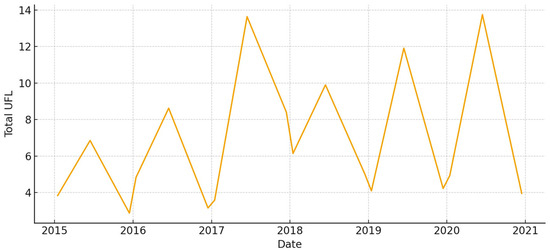 The total aboveground biomass (kg DM ha−1) shows a clear seasonal pattern, with more of it building up during the cool, wet months and then dropping off sharply in the summer (Figure 5). Occasional spikes in total biomass correspond to favorable winter–spring rainfall. Total UFL follows biomass during green-up but drops more quickly during summer senescence (Figure 6). This shows that quality and quantity are not linked in the late season. Total UGM has short lags compared to resource pulses (Figure 7), which means that grazing pressure moves toward patches that are easier to reach and of higher quality as low-marsh pastures dry out and die.