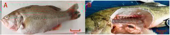 Symptoms of LMBV infection in largemouth bass. Body surface ulceration, fin bleeding, and the visceral signs, particularly splenomegaly, are evident. (A) fish fin ray hemorrhage; (B) fish splenomegaly. The red circles in the figure indicate that splenomegaly occurs in fish after infection with LMBV.