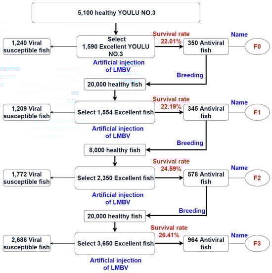 The selective breeding process of generations of Largemouth Bass resistant to LMBV. The survival rates for F0, F1, F2, and F3 were 22.01%, 22.19%, 24.59%, and 26.41%, respectively. The blue font indicates the specific operating procedures, and the red font represents the survival rate of each generation.