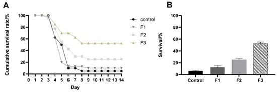 Cumulative survival rates (A) and survival rates (B) of largemouth bass infected with LMBV. All four groups begin to perish in significant quantities from the third day onward. By the seventh day, merely 10% of the control group persisted, 12.5% of F1 persisted, 30% of F2 persisted, and 62.5% of F3 persisted. On the ninth day, no additional fatalities transpired in the four groups, and by the fourteenth day, the survival rate reached a state of equilibrium. The ultimate survival rates for the control group were 5%, whereas those for F1, F2, and F3 were 10%, 25%, and 52.5%, respectively, surpassing the control group’s rate.