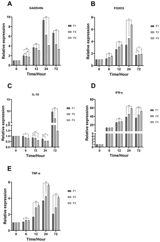 Relative expression of immune factors in the spleen of largemouth bass infected with LMBV. Total RNAs were extracted from the spleen tissues from F1, F2, and F3 at 6 h, 12 h, 24 h, and 72 h for detection of GADD45b (A), FOXO3 (B), IL-10 (C), IFN-γ (D), and TNF-α (E) post-infection using qRT-PCR. * At p < 0.05 and ** at p < 0.01.