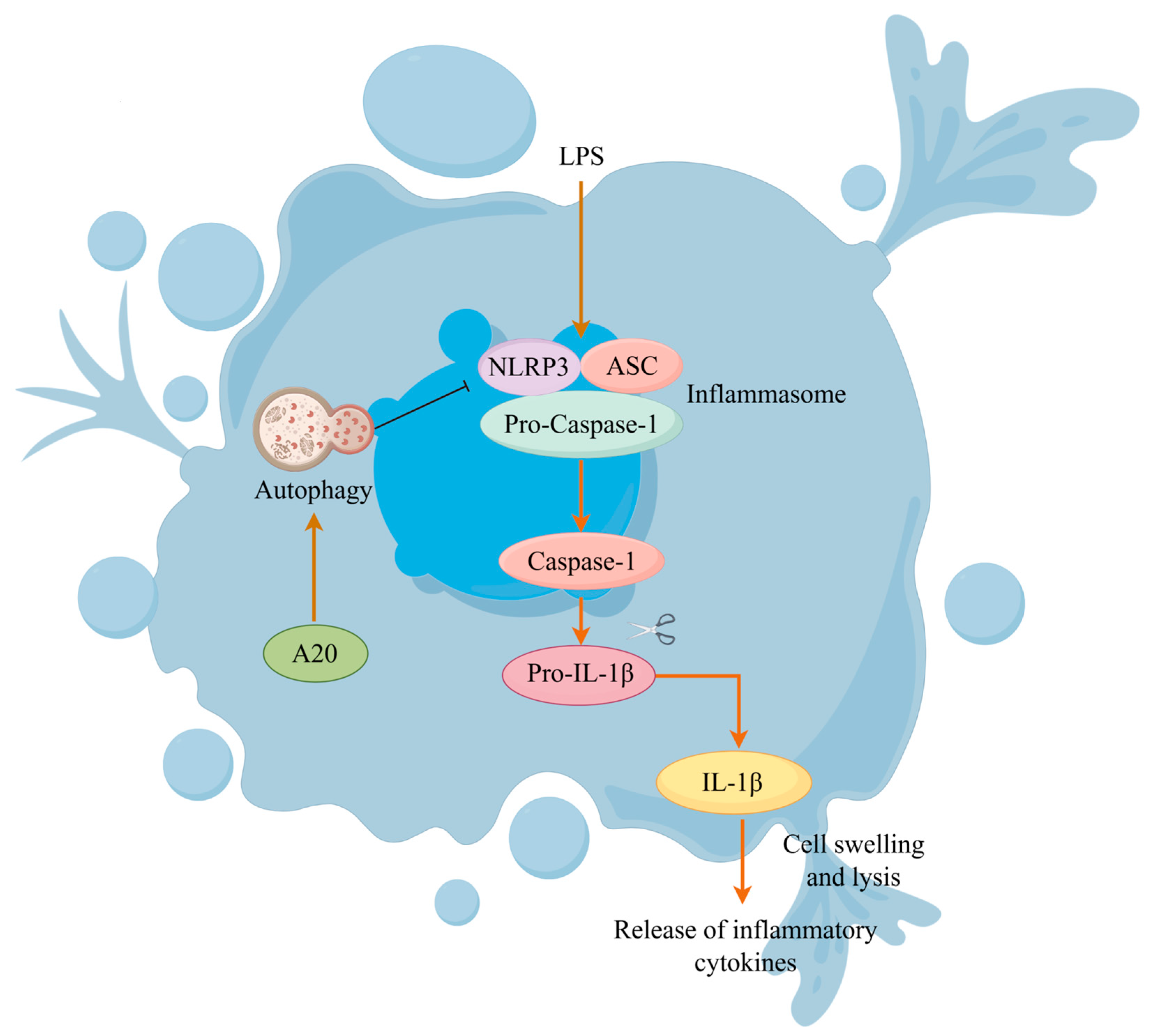 - Yu, J.; Li, H.; Wu, Y.; Luo, M.; Chen, S.; Shen, G.; Wei, X.; Shao, B. Inhibition of NLRP3 inflammasome activation by A20 through modulation of NEK7. Proc. Natl. Acad. Sci. USA 2024, 121, e2316551121. [Google Scholar] [CrossRef]