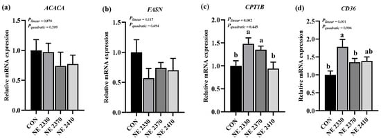 Effects of dietary energy density on mRNA expression of lipid-metabolism-related genes (a–d). (a) ACACA, acetyl-CoA carboxylase alpha; (b) FASN, fatty acid synthase; (c) CPT1B, carnitine palmitoyltransferase 1B; (d) CD36, CD36 molecule. a,b Different letters on the bars indicate significant differences between groups.
