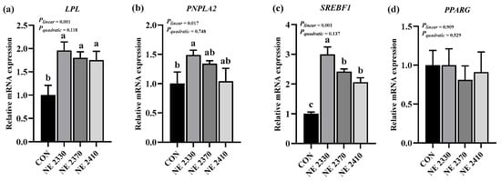 Effects of dietary energy density on mRNA expression of lipid-metabolism-related genes (a–d). (a) LPL, lipoprotein lipase; (b) PNPLA2, patatin-like phospholipase domain containing 2; (c) SREBF1, sterol regulatory element binding transcription factor 1; (d) PPARG, peroxisome proliferator-activated receptor gamma. a,b,c Different letters on the bars indicate significant differences between groups.