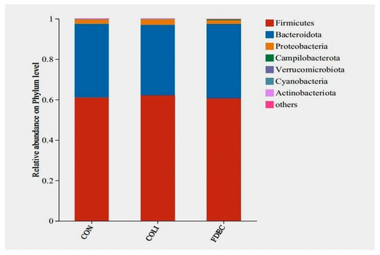 Composition of caecal microbiota of the broilers among the 3 groups at phylum level. CON, fed basal diet; COLI, basal diet + E. coli challenge; FDEC, basal diet + 500 mg/kg FDE + E. coli challenge.