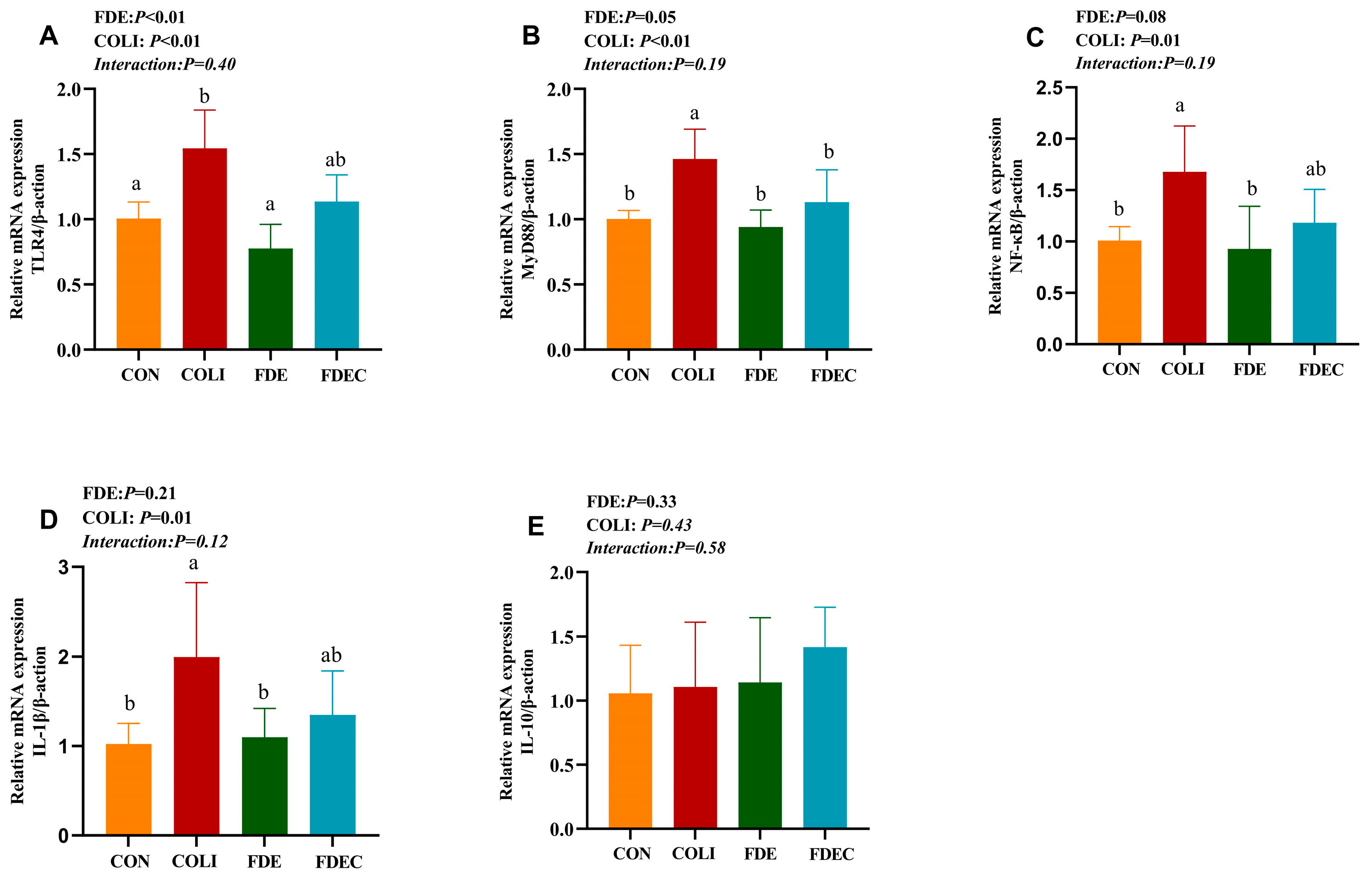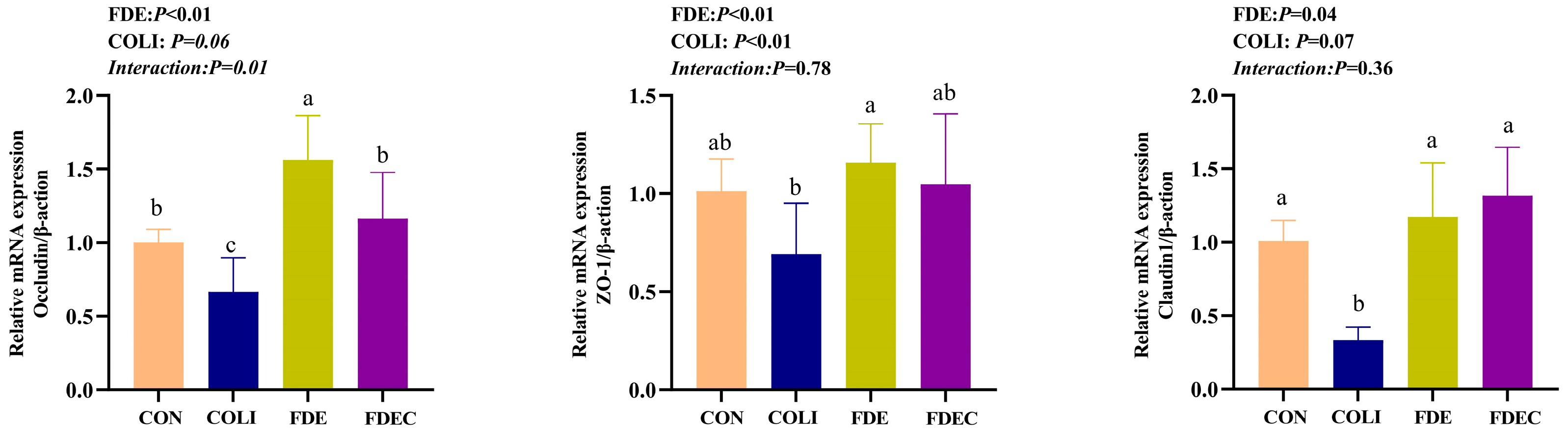 Tight junctions between intestinal epithelial cells form a selectively permeable barrier that not only allows the transfer of nutrients, ions, and solutes but also helps maintain the integrity of the intestinal mucosal barrier and intestinal health by preventing the transport of intestinal microorganisms, antigens, and toxins into tissues. [45,46]. This research specifically examines alterations occurring in the molecular components responsible for maintaining these junctional complexes. The results showed that E. coli infection impaired intestinal barrier function, manifested by downregulation of Occludin and Claudin-1 mRNA expression in the jejunum. FDE supplementation upregulated the mRNA expression levels of tight junction-related genes (Occludin, Claudin-1, and ZO-1), which is associated with enhanced intestinal barrier integrity. Chen et al. (2023) further confirmed that FDE supplementation enhances tight junction protein synthesis and preserves intestinal epithelial structural stability during lipid peroxidation challenges [19]. Based on the results of serum markers, intestinal morphology and relevant gene expression, we believed that FDE supplementation protected against E. coli-triggered intestinal barrier damage.