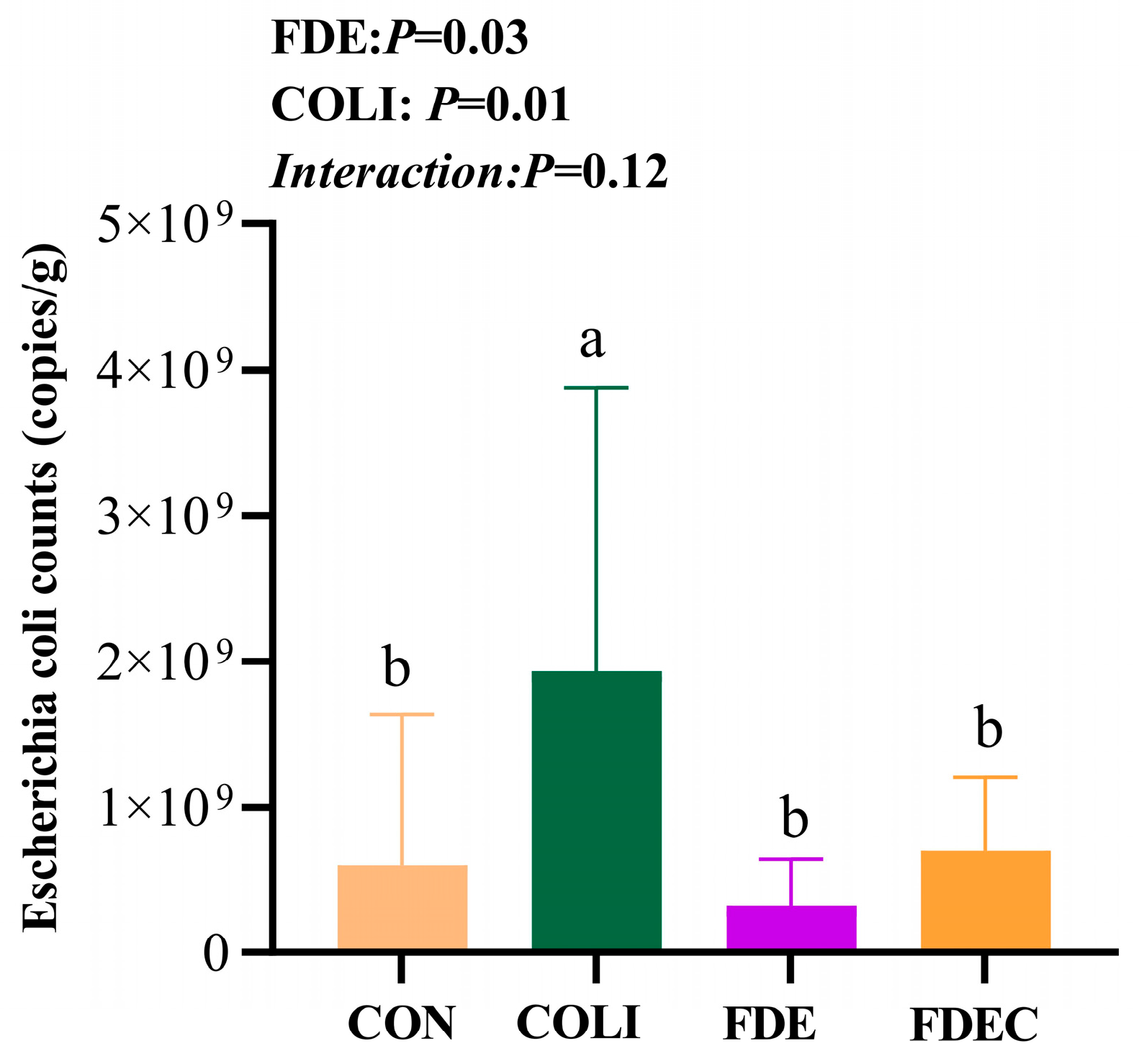 As shown in Figure 3, the main effect of COLI challenge significantly increased the number of E. coli in the cecum of broiler chickens (p < 0.05). Dietary FDE supplementation significantly reduced the number of E. coli (p < 0.05). There was no significant interaction between E. coli challenge and FDE supplementation on the number of E. coli in the cecum (p > 0.05).