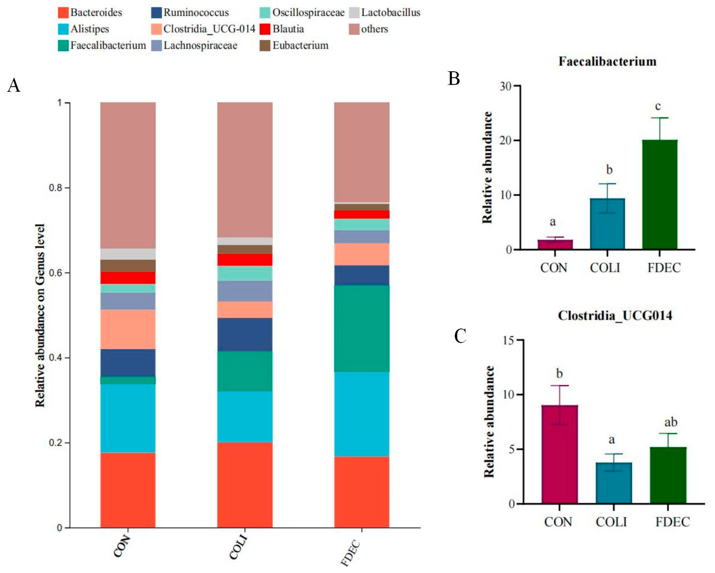 Figure 6. Genus-level relative abundance of microbiota from the cecal digesta of broilers: (A) classification of cecum flora compositions among the 3 groups at phylum level; (B) comparison of Firmicutes abundance among groups; (C) comparison of Clostridia abundance among groups. Lowercase letters in the bar graphs indicate significant differences (p < 0.05). CON, fed basal diet; COLI, basal diet + E. coli challenge; FDEC, basal diet + 500 mg/kg FDE + E. coli challenge.
