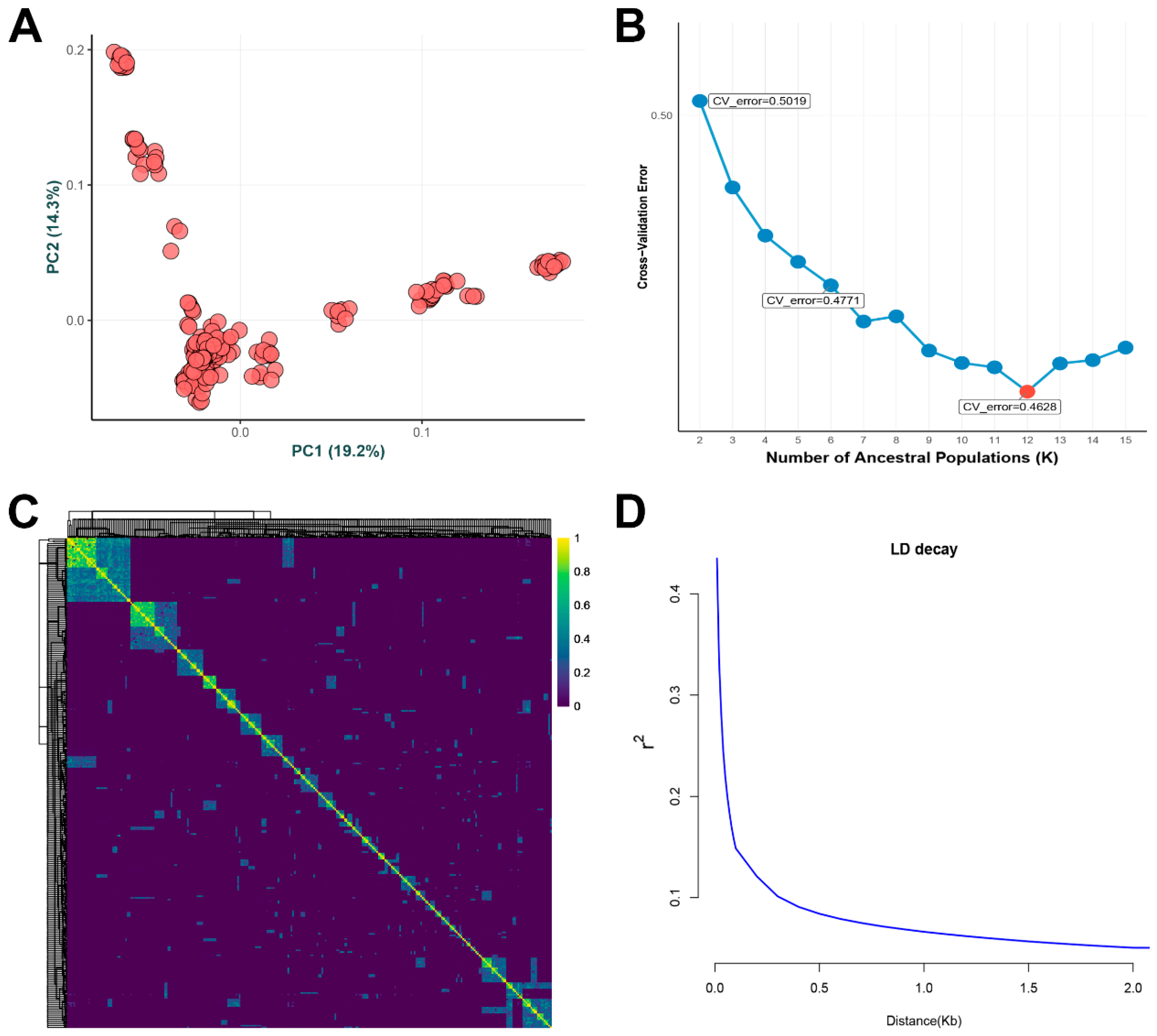 2.5. Linkage Disequilibrium (LD) and Population Structure Analyses