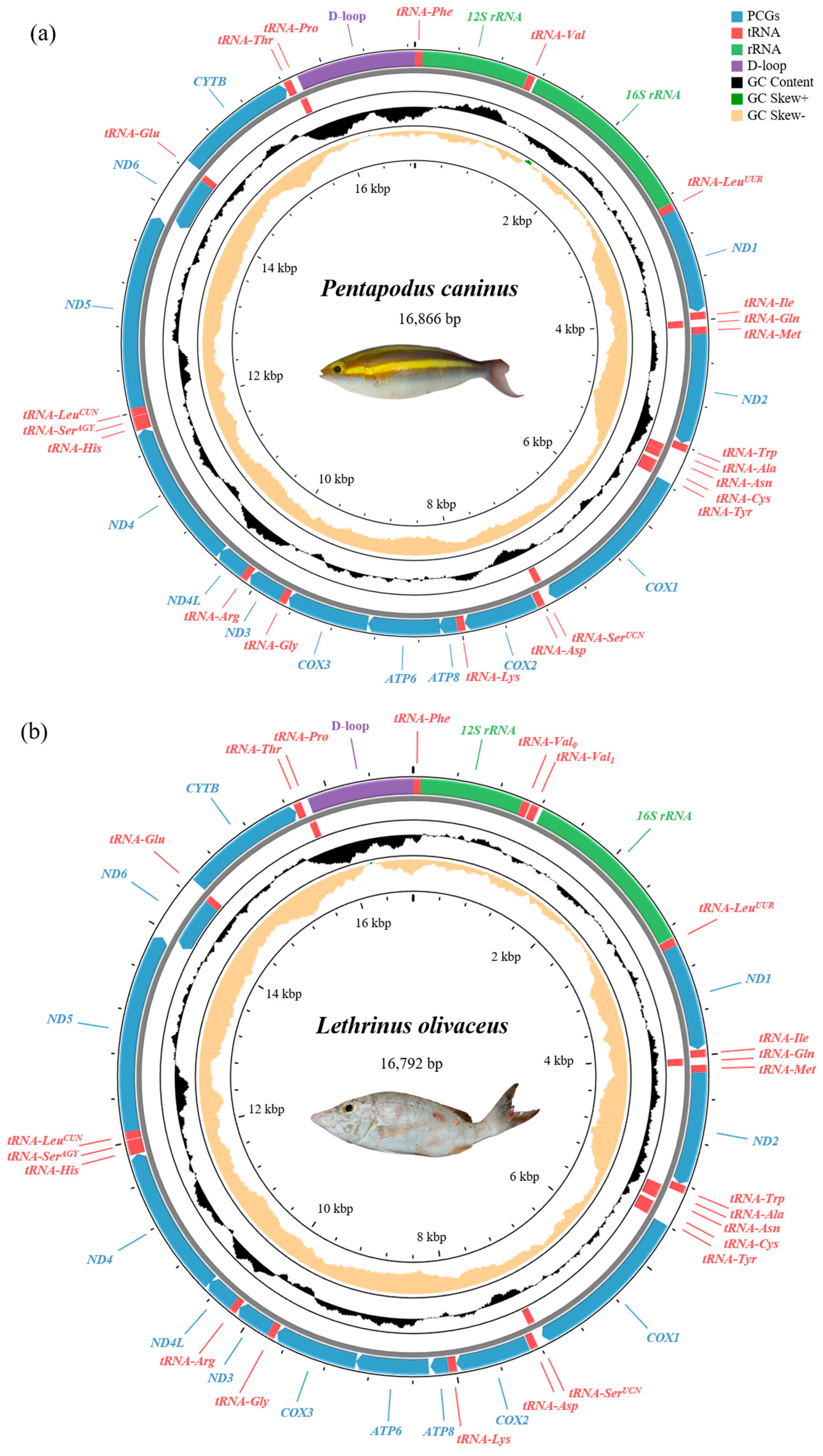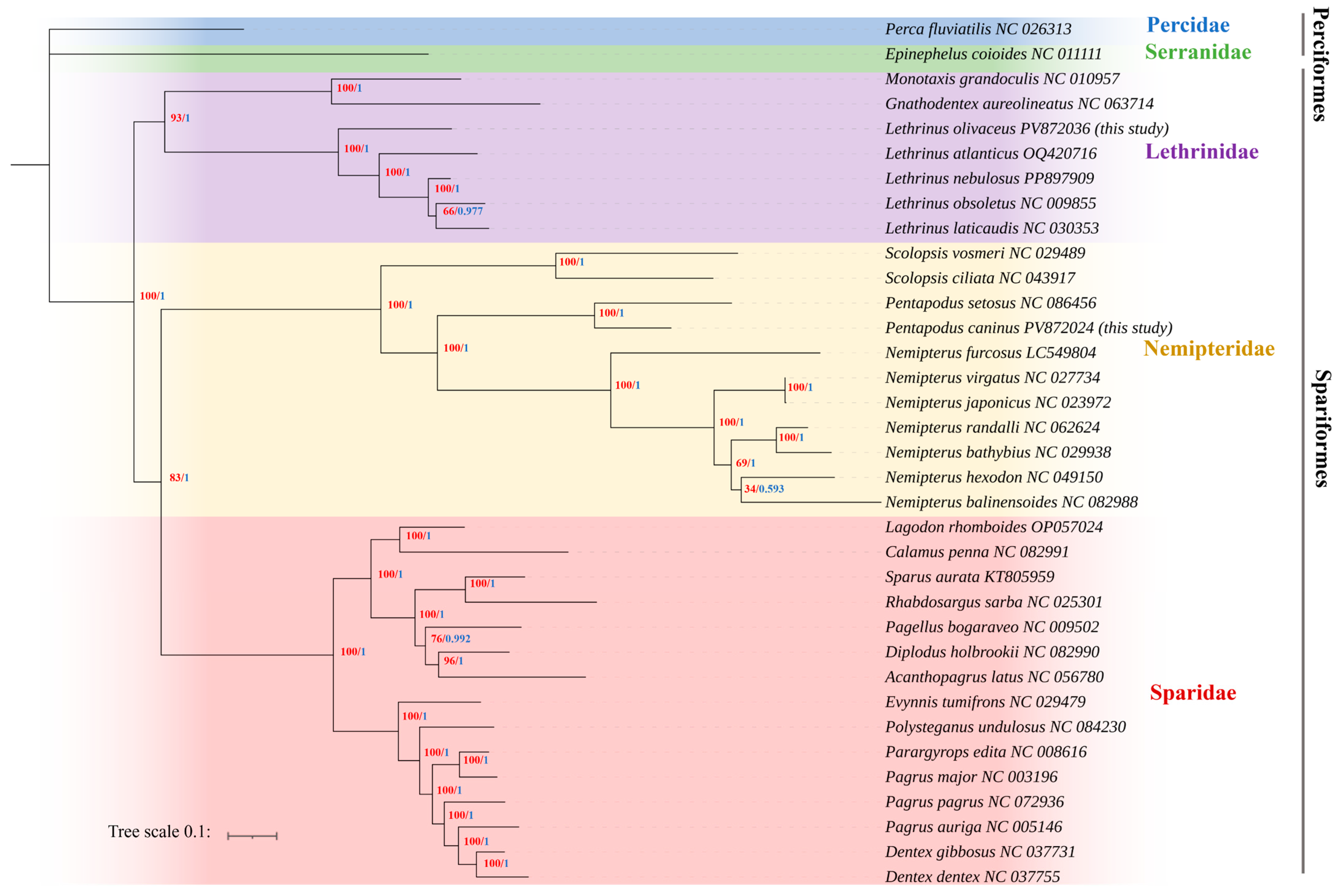 Chen N, Gu M, Jiang W, Xie L, Qiao Q, Cen J, Dong Y, Lu S, Cui L. Complete Mitochondrial Genomes of Pentapodus caninus and Lethrinus olivaceus (Spariformes: Nemipteridae and Lethrinidae): Genome Characterization and Phylogenetic Analysis. Animals. 2025; 15(24):3526. https://doi.org/10.3390/ani15243526