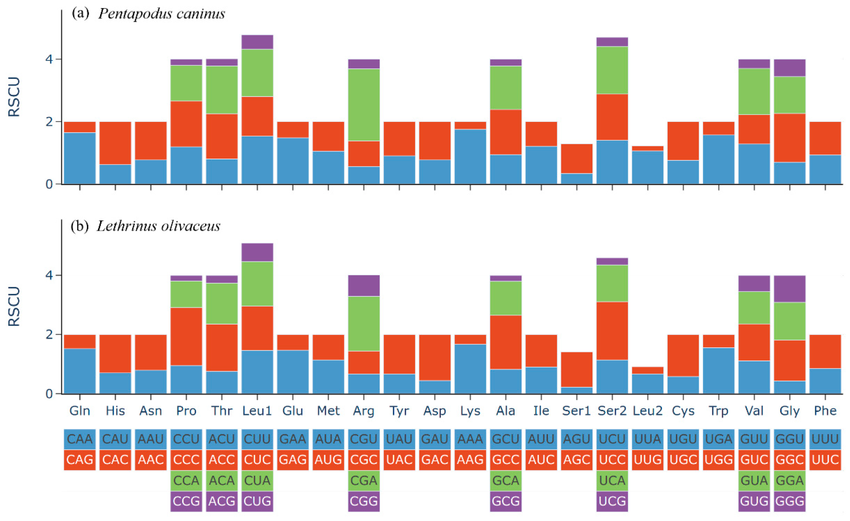 APA StyleChen, N., Gu, M., Jiang, W., Xie, L., Qiao, Q., Cen, J., Dong, Y., Lu, S., & Cui, L. (2025). Complete Mitochondrial Genomes of Pentapodus caninus and Lethrinus olivaceus (Spariformes: Nemipteridae and Lethrinidae): Genome Characterization and Phylogenetic Analysis. Animals, 15(24), 3526. https://doi.org/10.3390/ani15243526