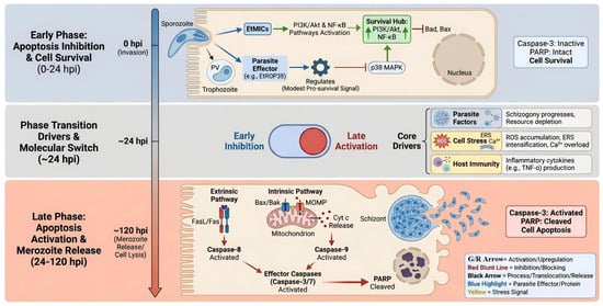 This review will systematically delineate the molecular network integrating the death receptor, mitochondrial, and ER stress pathways, and discuss the fine-tuning roles of non-coding RNAs. For conceptual clarity, we define the infection timeline as comprising an early phase (approximately 0–24 h post-infection, hpi), focused on parasite establishment and survival, followed by a late phase (approximately 24–120 hpi), characterized by parasite replication and egress. The proposed biphasic apoptosis model is framed within this temporal context. This synthesis aims to clarify Eimeria pathogenesis and ultimately support the development of novel interventions against poultry coccidiosis.