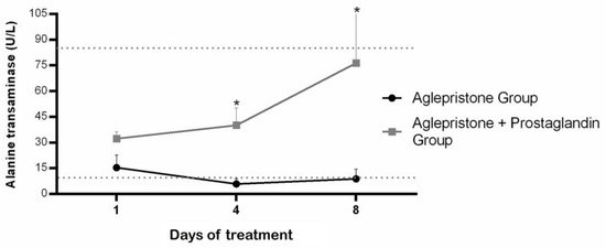 Mean ± SE of alanine transaminase (U/L) in the aglepristone and aglepristone + prostaglandin groups throughout the experimental time-points. * indicates significant differences (p = 0.004 and p = 0.006, respectively) between groups within the same time-point. Dotted lines represent the reference range for dogs.