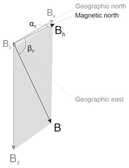 Schematic representation of the geomagnetic field (GMF) in the Northern hemisphere, Central Czechia. The relative magnitudes of the vectors are maintained according to their magnetic induction values. The total vector of the Earth’s MF magnetic induction (B) is a sum of two horizontal components (Bh = Bx + By), and a vertical component Bz. The angle α0 between the axis pointing to the true (geographic) north, and Bh, corresponding to the direction of the compass needle pointing to magnetic north, is the magnetic declination of GMF, often referred as D. In the northern hemisphere Bz is pointing downwards perpendicularly to Bh, thus GMF lines point down with the angle β0 indicating its magnetic inclination, designated as I. The length of the vector components is proportional to their magnetic induction measured in µT.