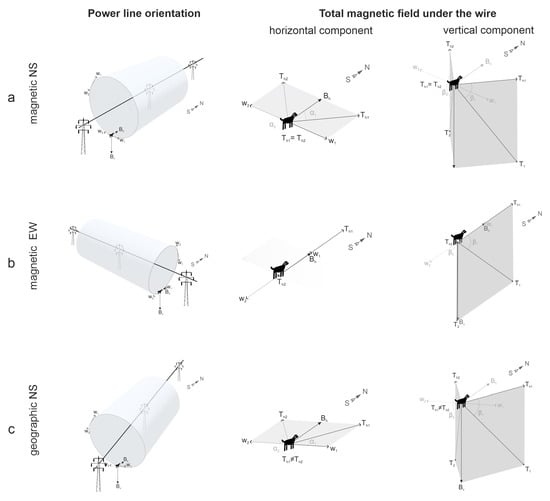 The physical phenomena related to GMF and MF under high-voltage PL are depicted in Figure 1 and Figure 2. In the absence of artificial MF sources or strong natural anomalies, animals rely on GMF as a cue for orientation. GMF properties (direction, declination, inclination, and magnetic induction indicative of the field strength) are shown in Figure 1. High-voltage PL generates alternating MF at 50 Hz (the standard frequency in the Czech Republic). These fields reach their maximum intensities directly beneath PL, at mid-span between pylons, where conductor sag brings the lines closest to the ground: approximately 15 µT for 380 kV, 8 µT for 220 kV, and 5 µT for 110 kV lines [50,51]. At such locations, MF is the resultant total field T, defined as the vector sum of GMF (B) and the wire-generated MF (W) according to the superposition principle. T oscillates 50 times per second within a defined angular range determined by the relative orientation of PL relative to GMF (Figure 2). It seems possible that dogs can perceive this oscillating field, as the 50 Hz frequency falls within the neural processing range for both their visual and somatosensory stimuli [52]. However, it is more likely that the presence of multiple, rapidly changing magnetic signals deviating from magnetic north may interfere with their magnetic sense, causing alignment disruption through compromising either magnetically modulated visual patterns or the magnetic compass itself [16].