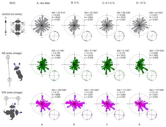 In control, GM deviated progressively from the NS axis (relative to magnetic N) toward the EW axis with increasing geomagnetic disturbances, when RCD changed from 0% to 2% and higher (Table 1, Figure 4b–d). These directional changes were highly significant (LME: F = 6.12, p = 0.0022). In contrast, under NS-oriented PL wires, GM changed only slightly (Table 1), with differences that were not significant (F = 0.23, p = 0.79). Under EW-oriented PL, GM showed a minor clockwise shift, but again, changes were not significant (F = 0.59, p = 0.55).