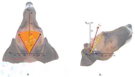 Horizontal component of the total field T under the high-voltage PL versus dog’s alignment (2D representation of 3D system). (a) total field under NS-directed PL; (b) total field under EW-directed PL (the angles are scaled according to the 3D positions of the vectors). N, W—magnitudes of the corresponding components, figures on the scale indicate magnetic induction in µT. Bh—horizontal component of GMF at the given location away from the wires, Th1, Th2—alternating horizontal component of the total field, designation of α1, α2 correspond to that in Figure 2. The dog’s head in the background is included for illustrative purposes only.