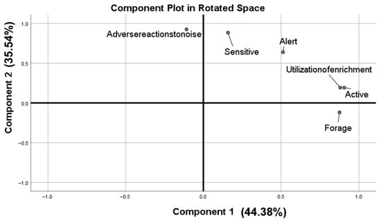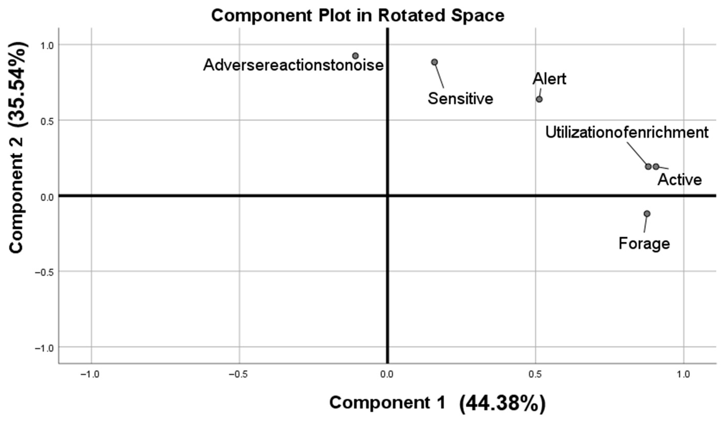 Sampling adequacy was supported by a KMO = 0.713 and a significant Bartlett’s test (p < 0.01). Inspection of the scree plot and the >1 eigenvalue rule indicated two principal components (PCs) that together explained 79.918% of the total variance. After varimax rotation, traits were assigned to the component on which they loaded highest (Figure 1; Table 4). Active, Forage, and Utilization of enrichment captured overall activity and defined PC1 (Activity); Alert, Adverse reactions to noise, and Sensitive reflected responses to risk or disturbance and defined PC2 (timidity).