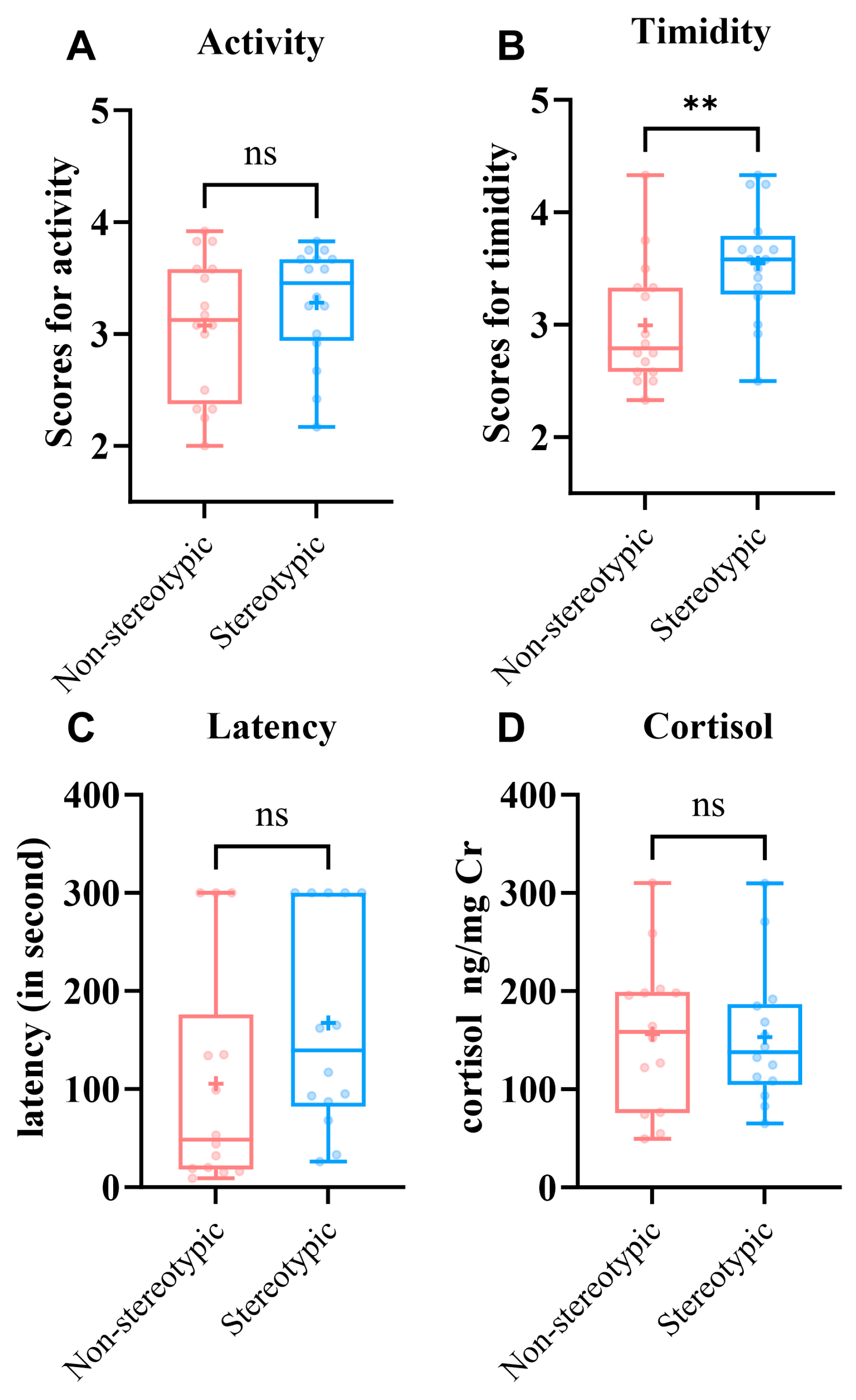 Between-group differences in personality and responses to a transport context in giant pandas. (A) Activity. Differences in Activity scores between the non-stereotypic (n = 16) and stereotypic (n = 16) groups. (B) Timidity. Differences in timidity scores between the non-stereotypic (n = 16) and stereotypic (n = 16) groups. (C) Differences in latency. scores between the non-stereotypic (n = 14) and stereotypic (n = 14) individuals. (D) Cortisol. Urinary cortisol (ng/mg Cr) in non-stereotypic (n = 14) and stereotypic (n = 14) individuals. (ns, not significant; “+”, mean; ** p < 0.01).