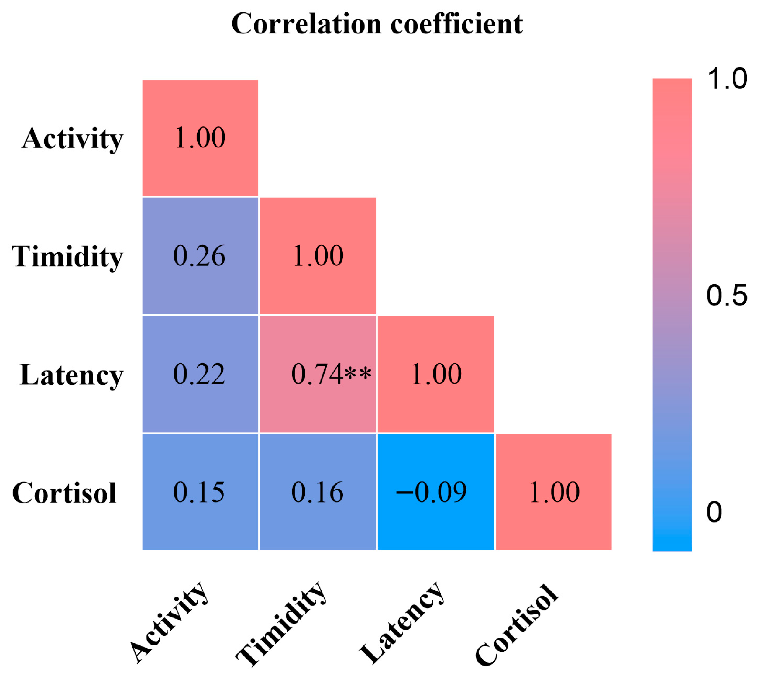 We examined associations between personality traits and crate entry latency and urinary cortisol (Figure 3). Timidity was strongly and positively associated with crate entry latency (ρ = 0.74, p < 0.01). Urinary cortisol showed no significant association with activity or timidity. These results indicate that individuals with higher timidity require more time to cope with or adapt to the stress context.