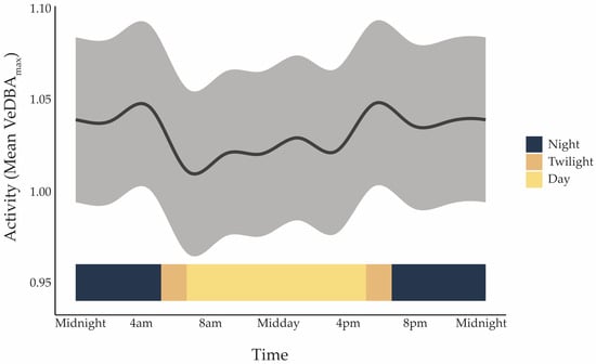 Mean activity level represented by Vectorial Dynamic Body Acceleration (VeDBAmax; m·s−2) of koalas over a 24 h cycle, pooled across all individuals (n = 9), predicted from a Generalised Additive Mixed Model (GAMM). The grey shaded ribbon shows the model prediction with ±1 SD of the residuals. The coloured ribbon along the bottom indicates the timing of light phases in Pittsworth in May 2023: Night (18:30–05:00), Twilight (05:00–06:30 and 17:00–18:30), and Day (06:30–17:00). Peaks correspond to crepuscular periods, with reduced movement during daylight hours.